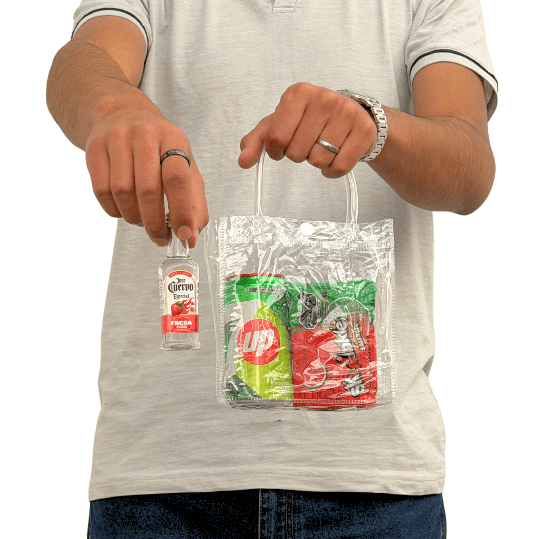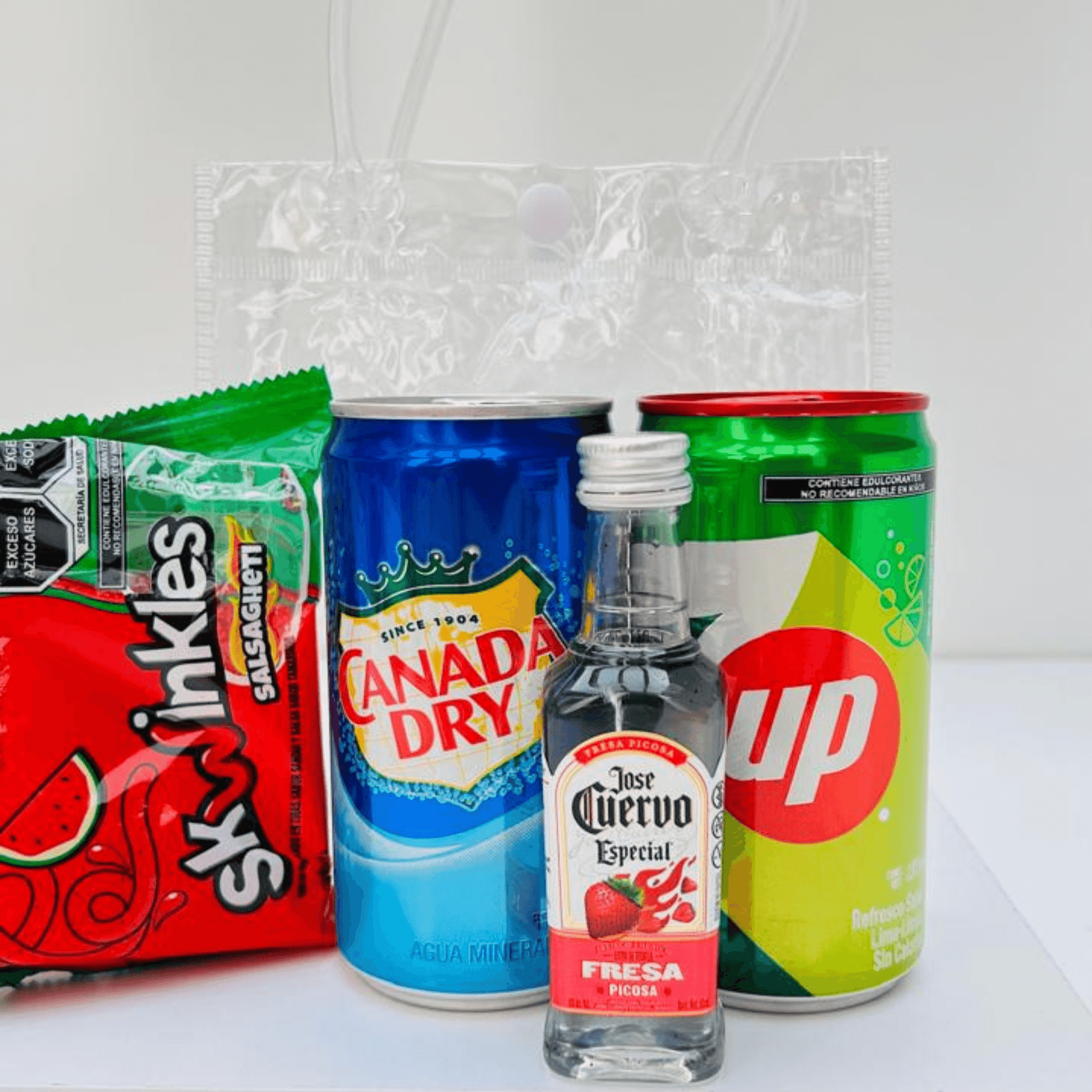 Mini Kit La Niña Fresa. Incluye mezclador 7up y canada dry, mini jose cuervo fresa picosa 50ml, skwinkles y bolsas transparente.