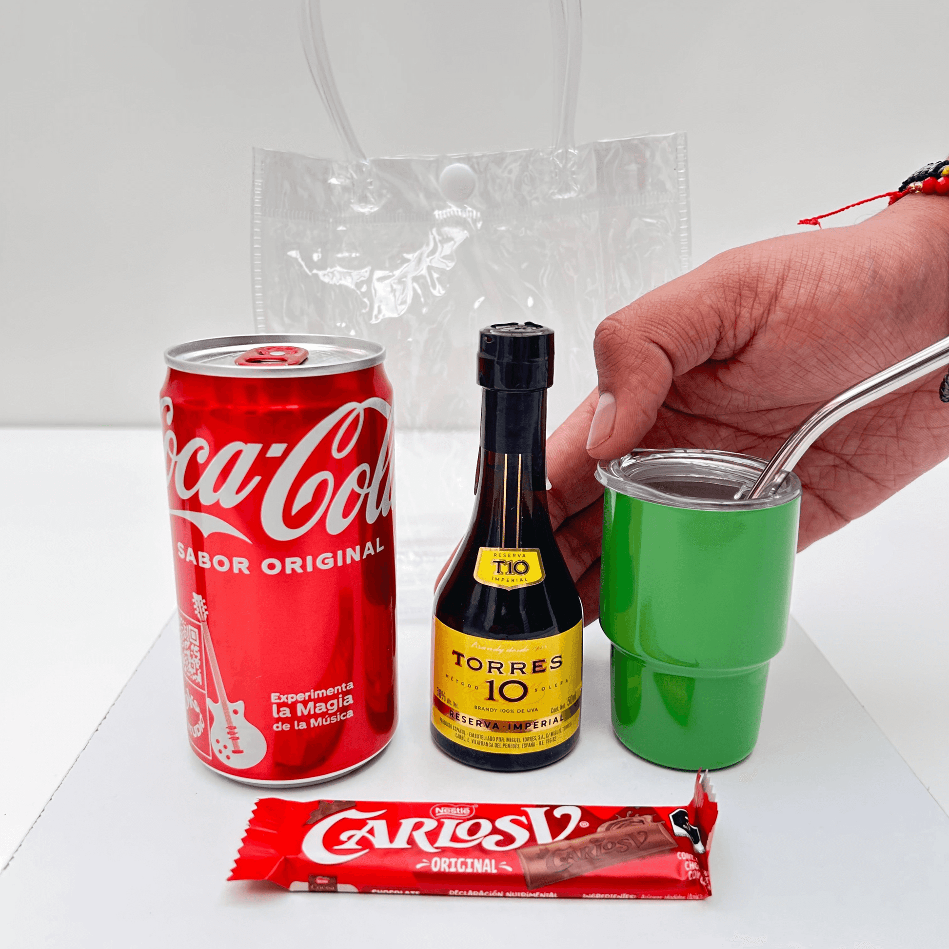 Mini Kit París de noche. Incluye mezclador coca cola, mini torres 10 50ml, mini termo 3oz, chocolate y bolsas transparente.